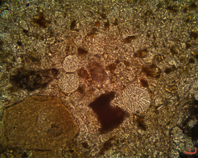 Smásjármyndir úr steypunni í brúnni yfir Breiðabalakvísl. Nú hafa myndast hringlaga kristallar í holrýmum þar sem áður var vatn