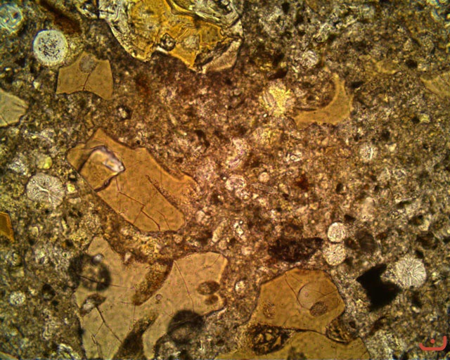 Smásjármyndir úr steypunni í brúnni yfir Breiðabalakvísl. Nú hafa myndast hringlaga kristallar í holrýmum þar sem áður var vatn
