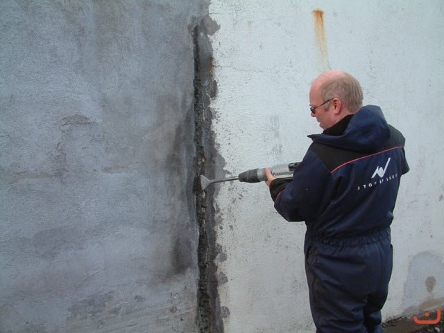 4x4cm rauf er höggin þar sem lekinn er. Töluvert af vatni vætlar út úr raufinni.
