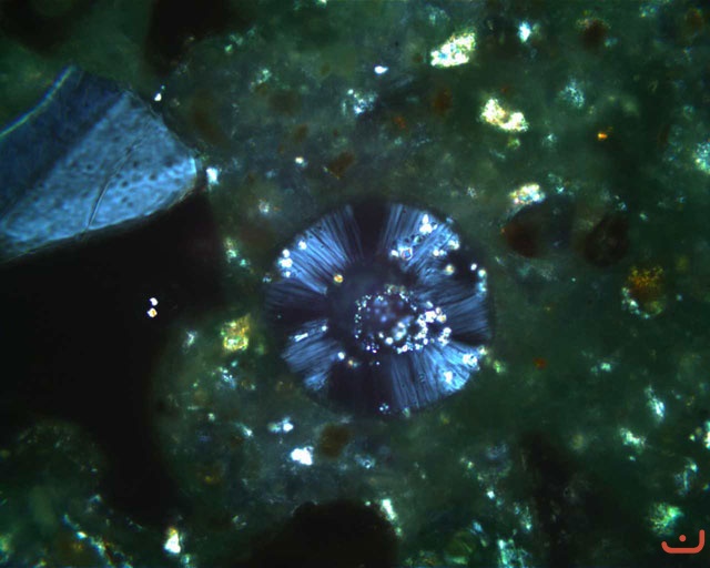 Smásjármyndir úr steypunni í brúnni yfir Breiðabalakvísl. Nú hafa myndast hringlaga kristallar í holrýmum þar sem áður var vatn